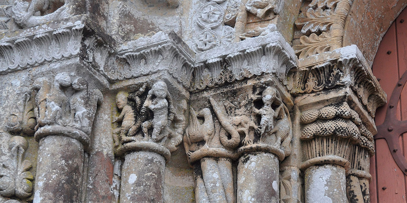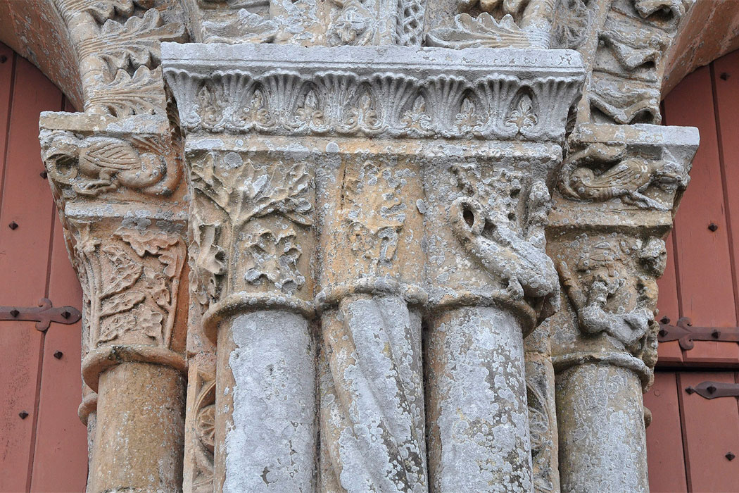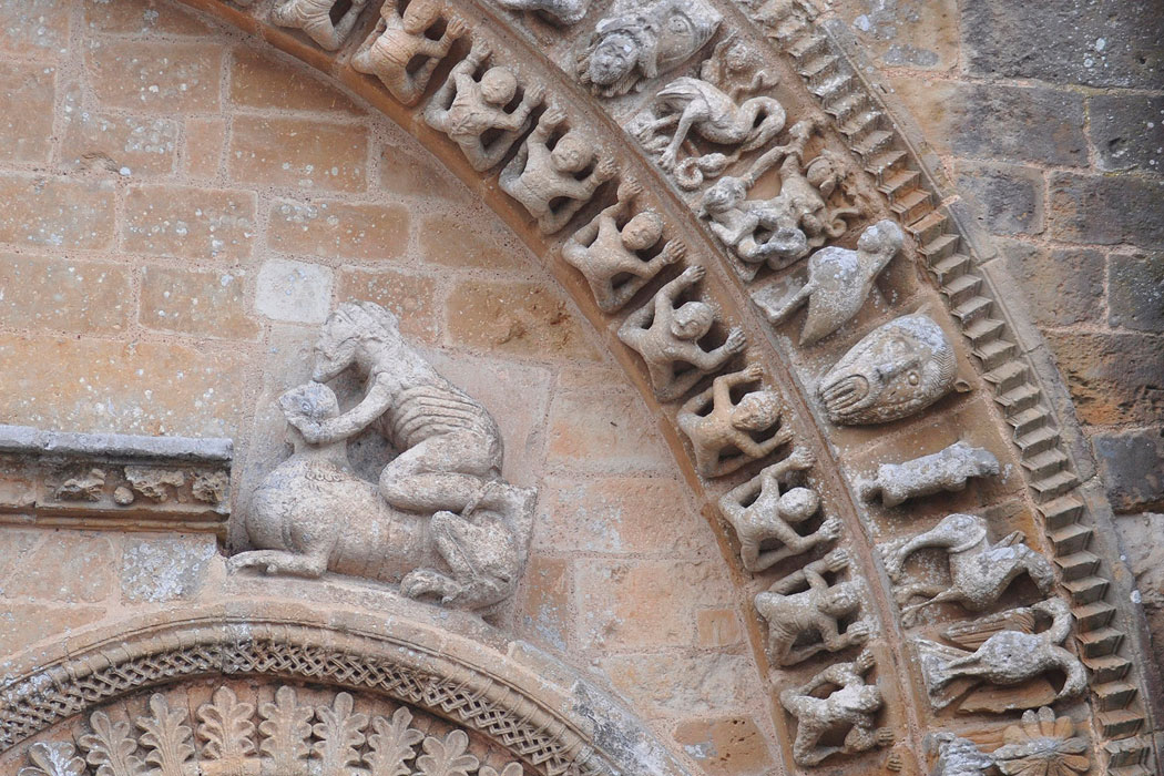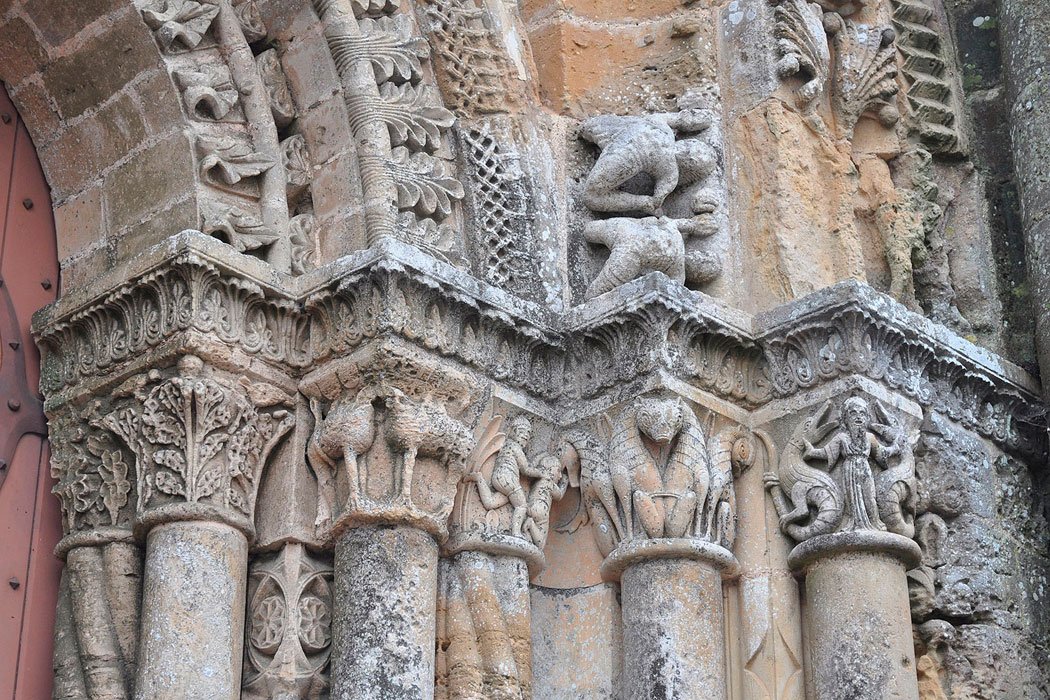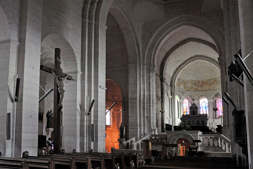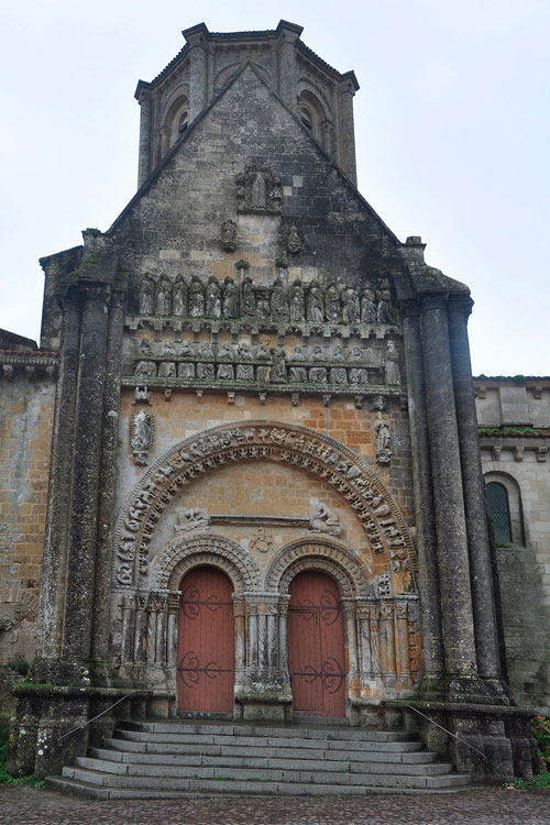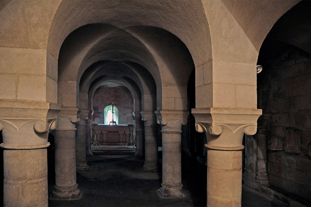 De la iglesia primitiva del siglo XI se conservan tres tramos de la parte occidental, probablemente cubiertos originalmente con bóvedas. Los tres primeros tramos, en cambio, se han perdido. Durante el siglo XII se reconstruyeron la cabecera y los tres tramos orientales de las naves, junto al transepto. En la misma época se levantó la fachada norte del transepto, con un portal doble. Entre los siglos XIV y XV, ese portal románico se completó con un frontón decorado con escenas que representan la Última cena, en la parte inferior, y la Ascensión, en la superior. Todo el conjunto fue restaurado durante los siglos XIX y XX, incluida la cripta, que prácticamente había desaparecido.