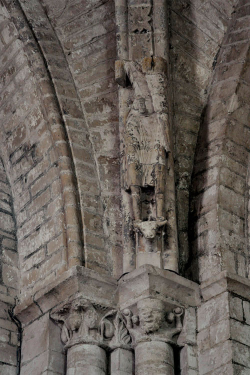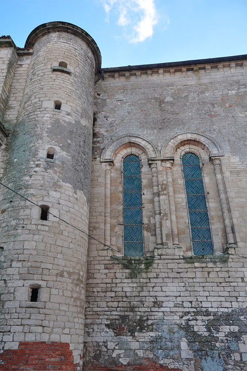 The church survives, with a single nave divided into two bays, dated between the 12th and 13th centuries. It has the particular feature of several large statues placed above the capitals, where the ribs of the vaults rest. It is not known which figures they represent: perhaps knights or royal figures, or possibly allegorical representations. According to M. Dillange, they might be interpreted as representations of virtues, although no secure identification exists. The transept and the chancel, with three apses, are earlier. The church also has a crypt.
