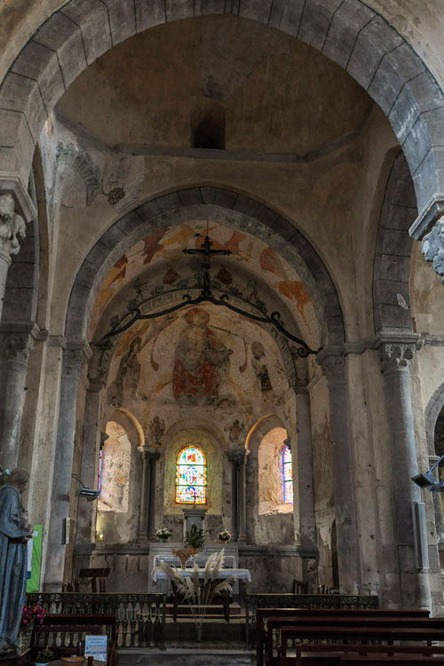 A pesar de las transformaciones sufridas con el paso del tiempo, conserva todavía la fisonomía del siglo XVII. En cuanto a la iglesia, se trata de una construcción de origen románico, con una sola nave de dos tramos, crucero y tres ábsides semicirculares. La cabecera es la parte más antigua y conserva capiteles románicos. La fachada occidental presenta un portal apuntado y, sobre él, un campanario de espadaña con cuatro arcadas. En el interior se venera una imagen de la Virgen atribuida a la escuela de Michel Colombe (†1515). El ábside conserva pinturas murales de finales del siglo XV, contemporáneas de las reformas efectuadas entonces.