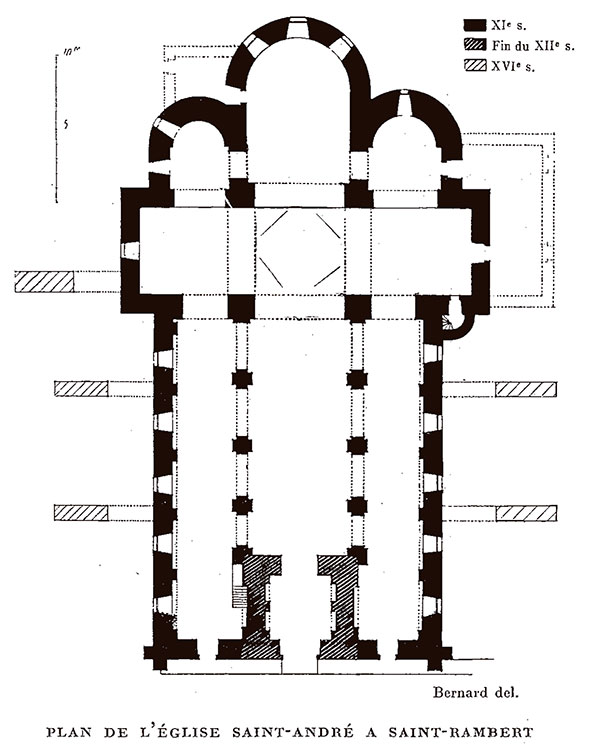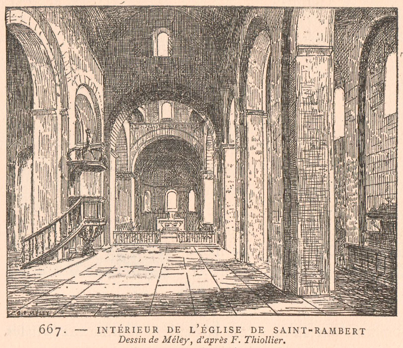 Por otra parte, Signerin afirma que la iglesia de Saint-André se habría fundado en época del obispo Aregius de Lyon (603-614). En cualquier caso, la parte más antigua de la iglesia —el atrio y torre occidental— es del siglo XI. Se considera que hacia el año 1078, en tiempos del conde Guillaume de Forez († 1097), se trasladaron aquí las reliquias de san Rambert († 680), que hasta entonces se custodiaban en la abadía de Saint-Rambert de Bugey (Ain). La llegada de estas reliquias impulsó el desarrollo del priorato, y el cambio de advocación de Saint-André a Saint-Rambert se habría efectuado en esa época.