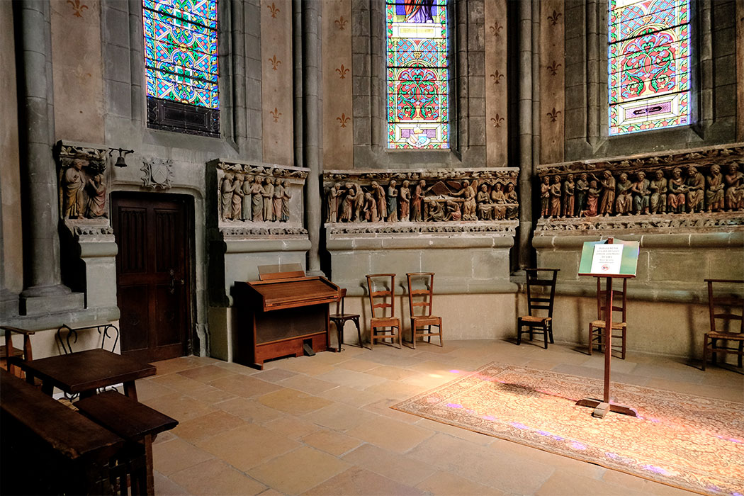 The crypt is the oldest part of the church and dates from the founding period (11th century). The nave and the chancel belong to the 13th century; at that time a rood screen decorated with polychrome high reliefs (1250-1260) was constructed, which was dismantled in 1825. These reliefs are now arranged in the apse of the church. After suffering fires and reaching a state close to ruin, much of the church, as well as other monastic buildings, was rebuilt in the 15th century. The cloister, from the same period, had two storeys and survives in part. Further modifications were later carried out, including alterations to the vaults and the construction of chapels within the church.