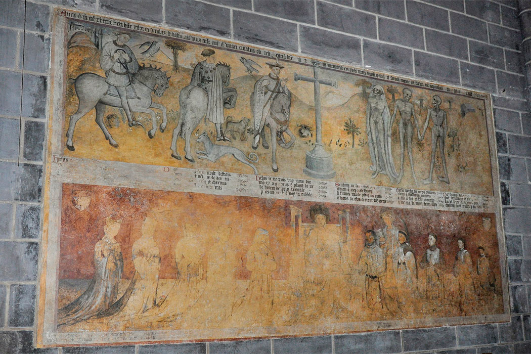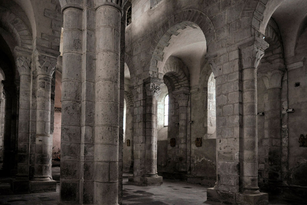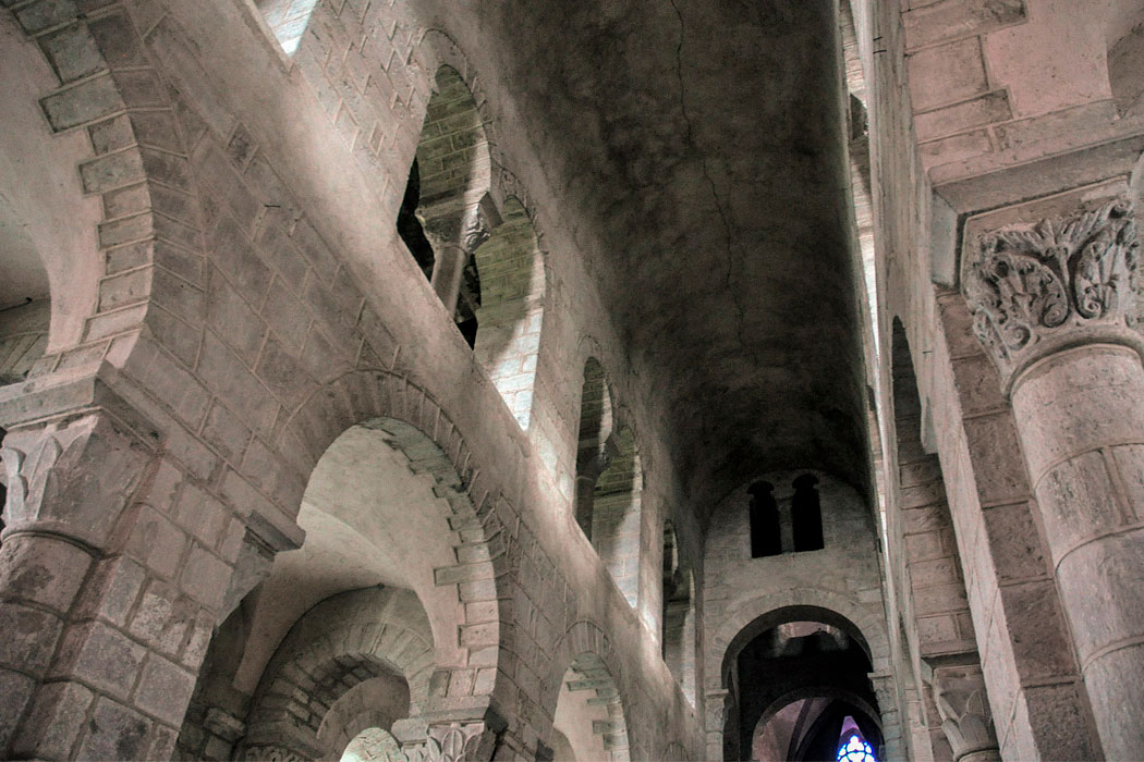 The present building preserves the structure of three narrow naves dating from the foundation period (11th–12th centuries), with a transept and central dome surmounted by a renovated bell tower. Originally, the chevet consisted of a large central apse with ambulatory, as is common in the region. This part was demolished in the 13th century to extend the church, keeping the width of the transept and adding a new chevet with five radiating chapels. It also had a narthex at the western end, modified in the 13th-century works and rebuilt during the 19th-century restoration. Inside, remarkable 15th-century wall paintings are preserved.