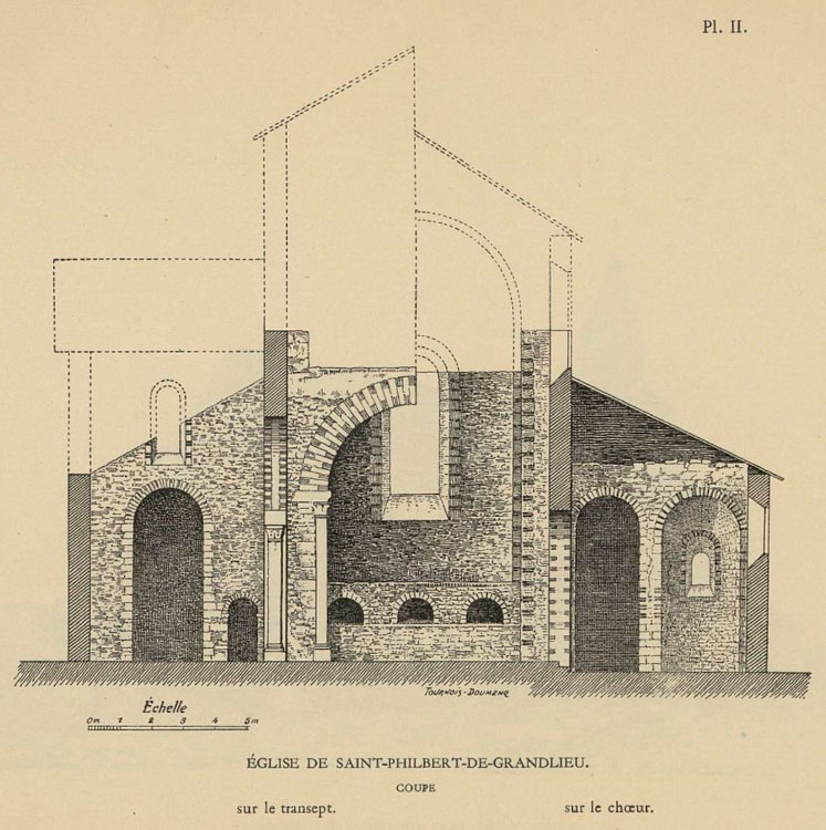Following the Revolution, the priory was sold; it later regained religious use as a parish until, in 1870, this function was transferred to a new building and the church was turned into a market. In 1896, the site was recognised and protected as a historic monument and restored in the following years. In 1936, it once again regained its religious function and the former tomb of Saint Philibert was restored. The church of Carolingian origin, dating from the 9th century, survives with later enlargements and modifications; it is characterised by the alternation of stone and brick in its construction. The architectural remains are difficult to interpret due to the many interventions it has undergone. The crypt from the period when it served as a place of veneration for the saint’s relics is also preserved.