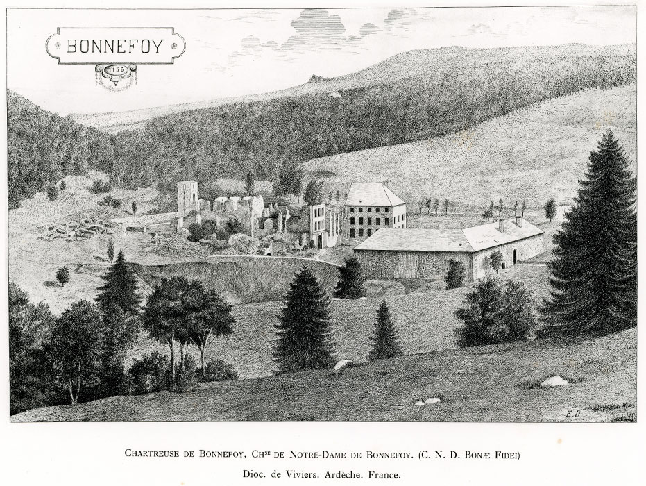 La cartuja de Notre-Dame de Bonnefoy fue fundada en 1156 gracias al mecenazgo de Guillaume de Fay (o Guillaume Jourdain), señor del lugar y castillo de Mézenc. En 1179 la comunidad ya estaba plenamente activa. Philippa, hija del fundador, emparentó con la casa condal del Valentinés (con centro en Valence) al casarse con Aymar II, y desde entonces el condado se convirtió en uno de los principales protectores de la cartuja.